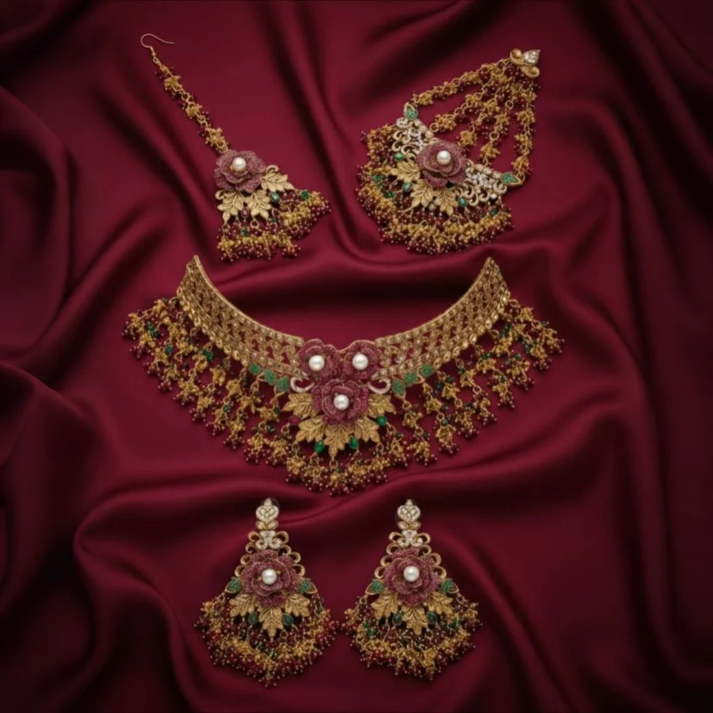 This collection provides a comprehensive and well-coordinated look since it includes all bridal accessories.