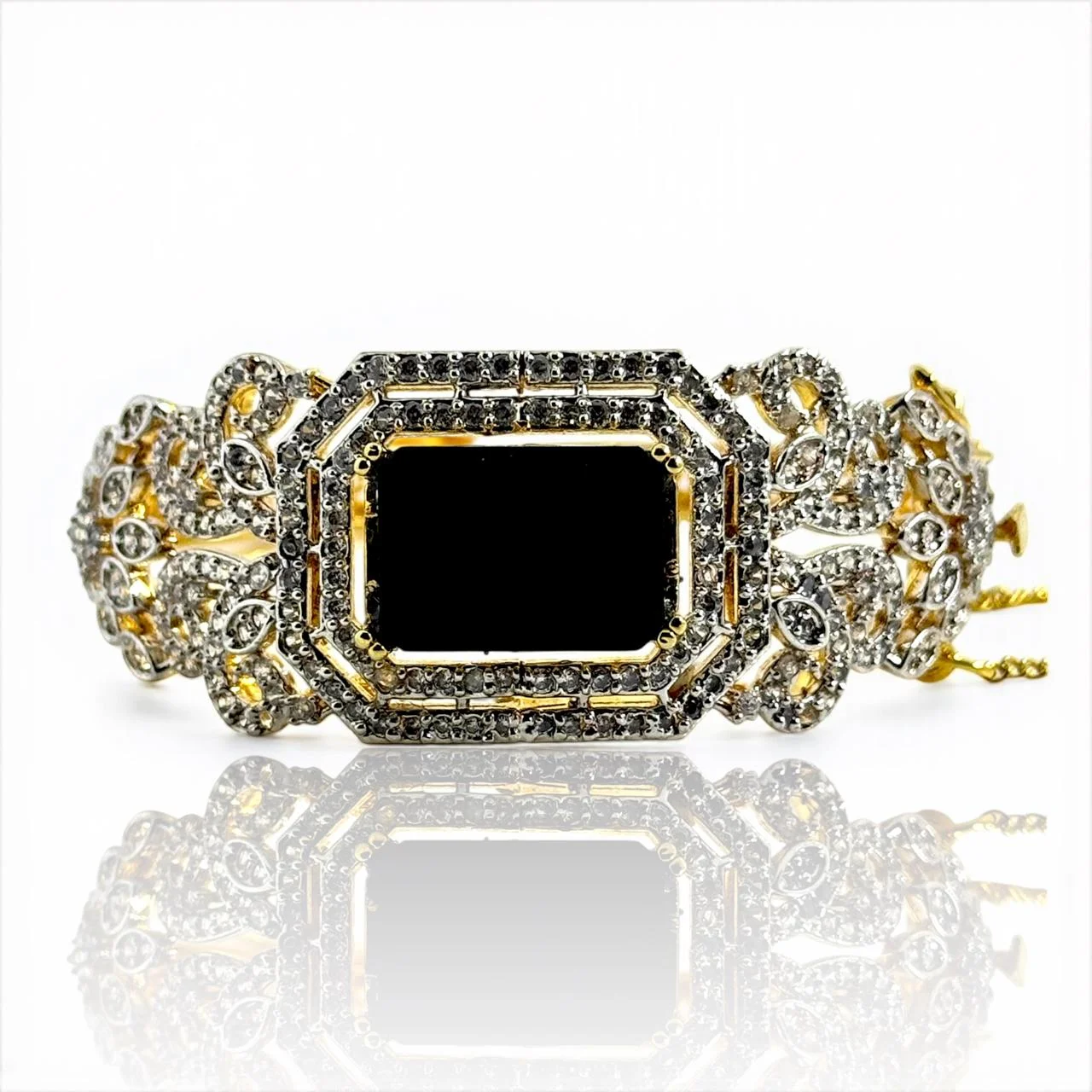 The stunning black stone centerpiece of this royal black bangle in size 2.4 is tastefully encircled by glistening silver zircon accents.