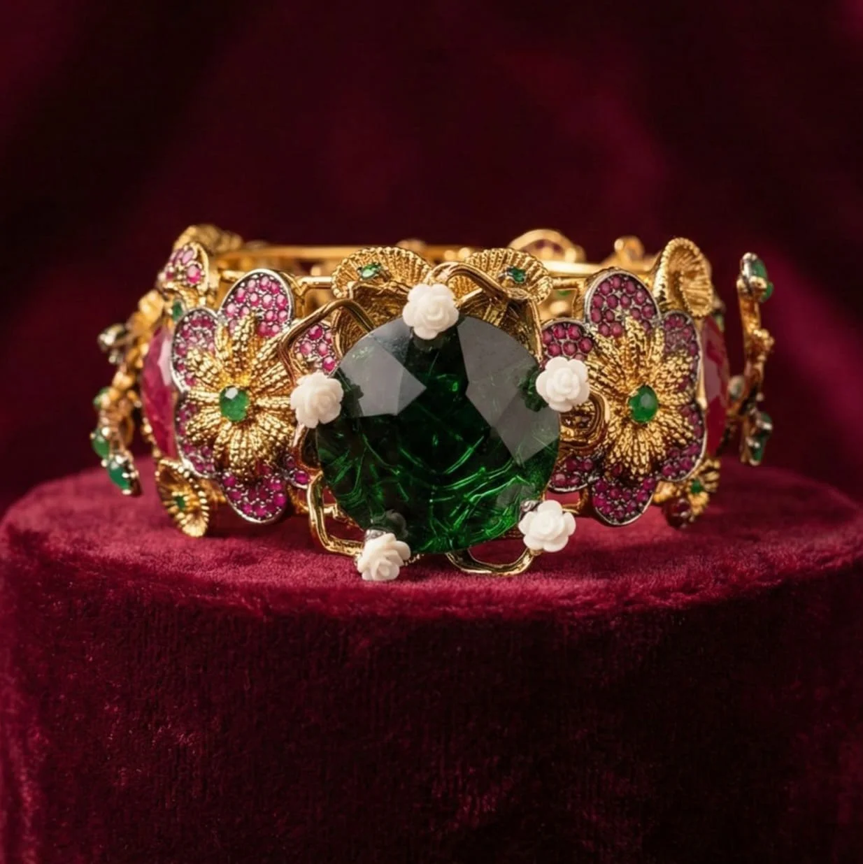 The focal point of this exquisite bangle is a gorgeous royal green stone, which is complemented with pink and green stones for a vibrant and rich appearance.