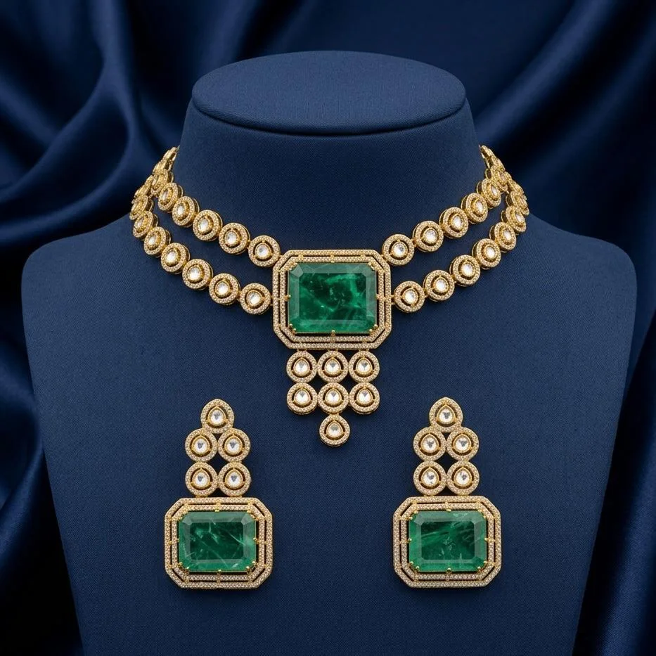 This set, which has a magnificent royal green stone in the middle, is embellished with glittering white stones that add to its opulent appeal.