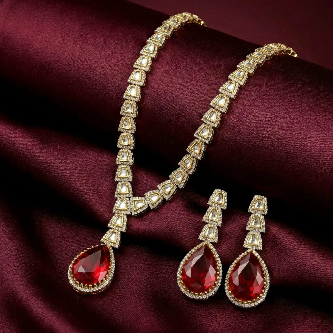 The set, which has a gold-plated frame, has glistening red stones that give it a striking, regal appearance.