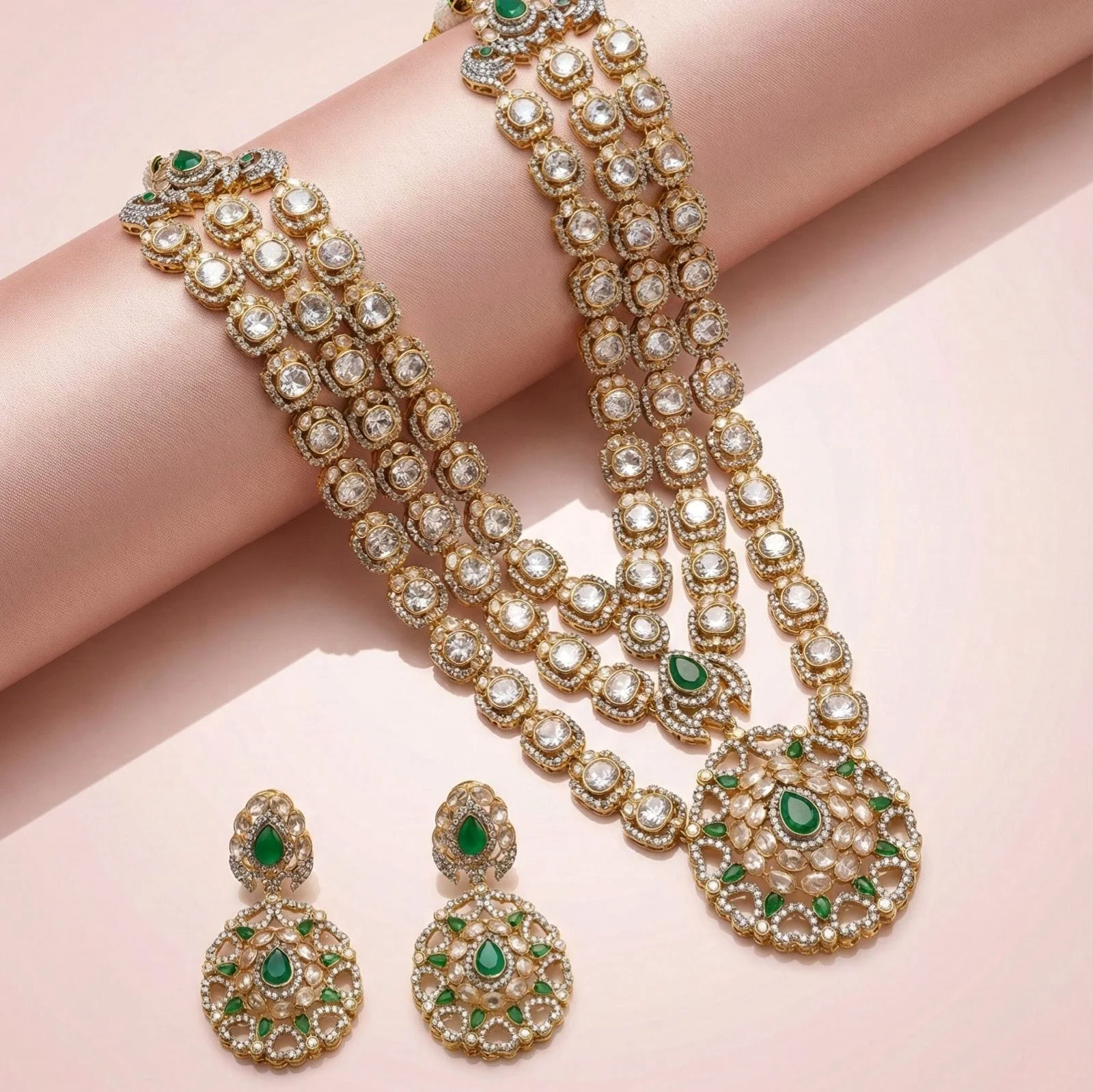 This set, which is made in a sophisticated tiered design, has a gorgeous mix of green and white stones that produce a rich, regal contrast.
