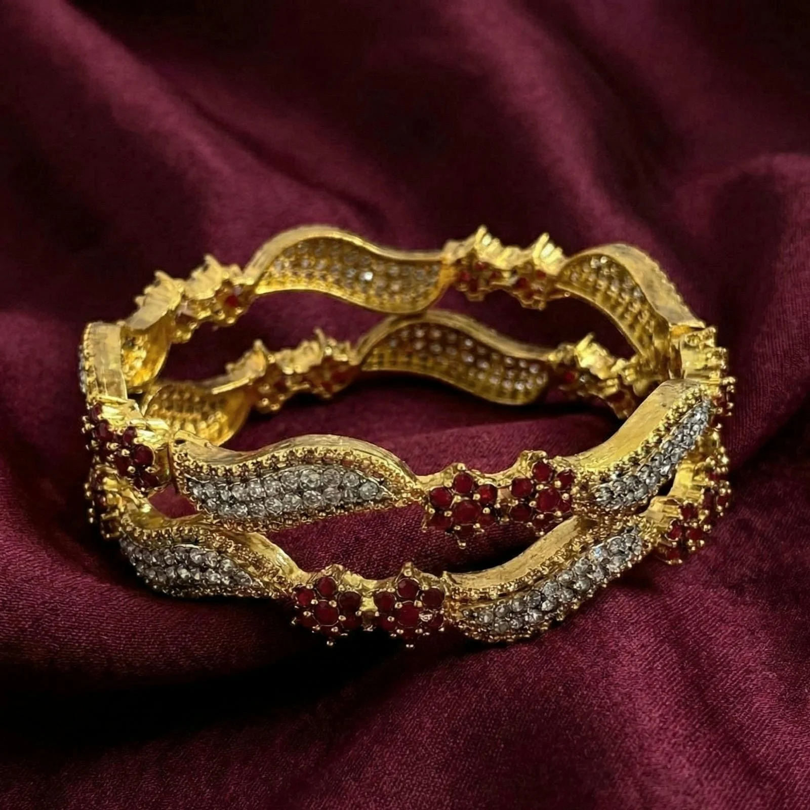 These sophisticated bangles have a combination of rich red or brilliant silver stones that are gently set in a polished, gold-plated frame for a dazzling, opulent look.