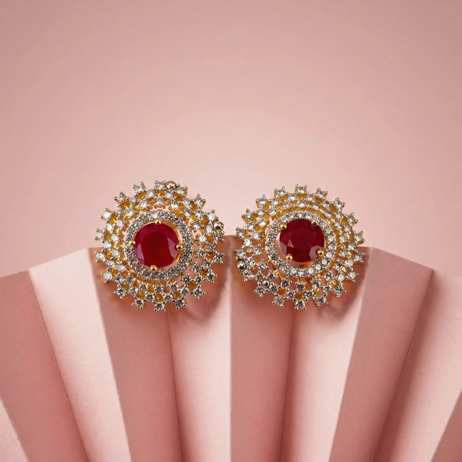 These exquisite studs have a rich red ruby-style stone in the center, surrounded by glittering small silver stones set in a sophisticated floral arrangement.