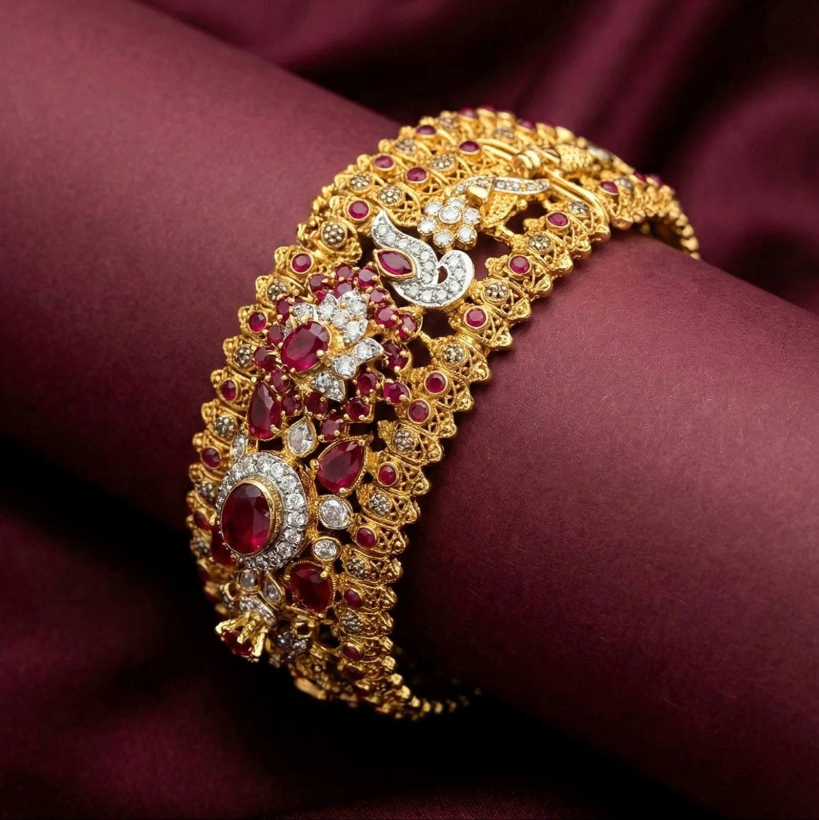 This gorgeous bangle has a floral-inspired design that is accentuated with glittering silver gems and embellished with sparkling red stones, giving it an opulent appearance.