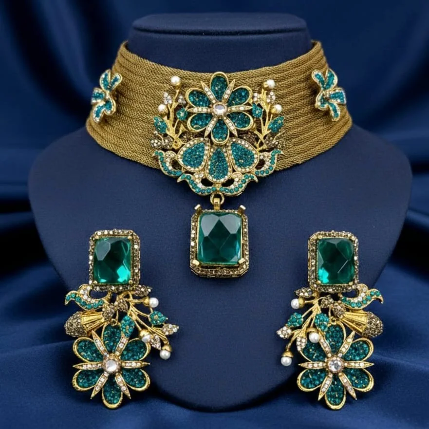 Stunningly embellished with glittering zinc gemstones and shining stones for an opulent radiance, this set of necklaces features a bright golden neckline.