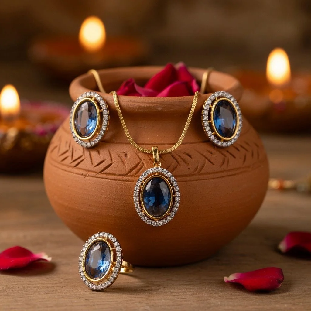 The polished gold-plated frame of this exquisitely created sky blue combination set displays a chic and sophisticated appearance.