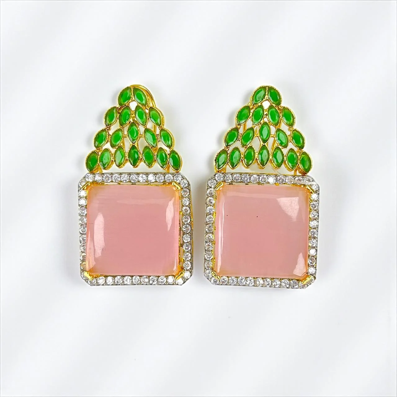 Beautifully adorned with delicate green stones that create a stunning contrast, these earrings include a vivid pink stone at the center.