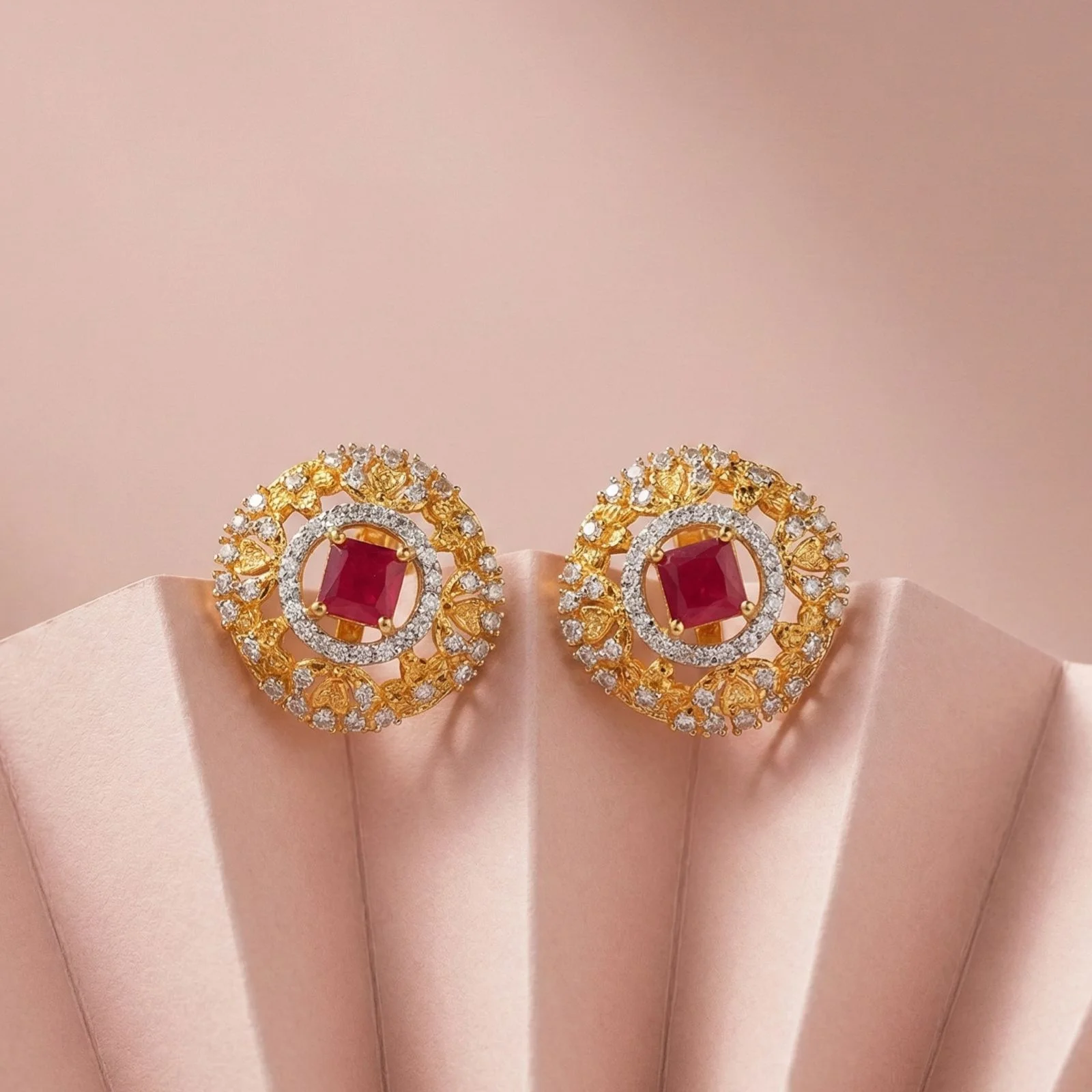 Each stud has a gold-plated frame with a brilliant red stone in the middle that is exquisitely encircled by shimmering silver stones or a detailed golden designer pattern.