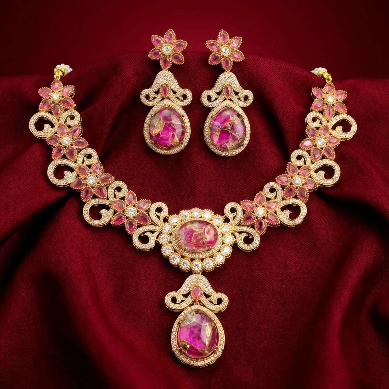 This exquisite classic pink jewelry set, which features a sophisticated flower design, is a wonderful way to honor timeless beauty.