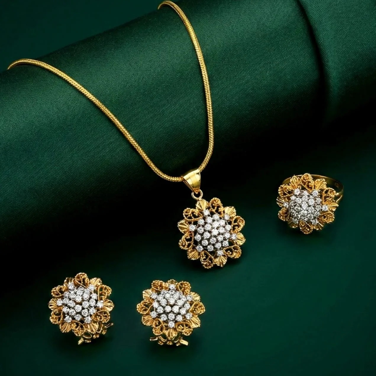 This gorgeous White Combo Set, which has a floral-style pendant and a golden chain, will add a touch of elegance and sophistication to your ensemble.