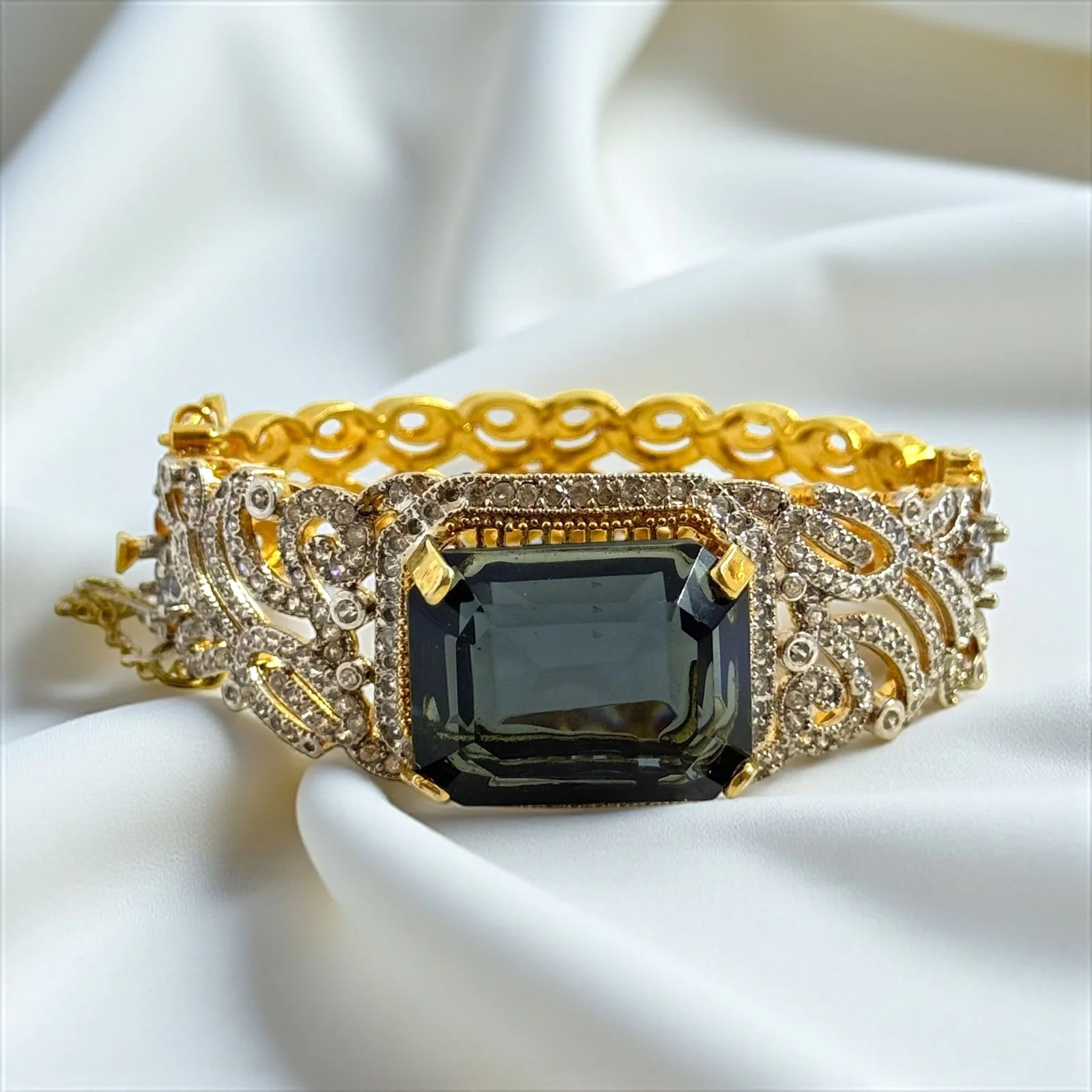 A layered effect without being bulky. This piece gracefully frames the collarbone. Soft pastels or clear white zircon give a bridal glow without overshadowing the outfit.